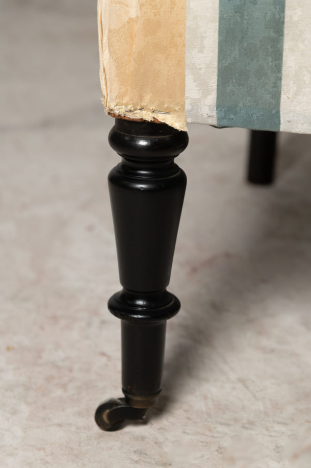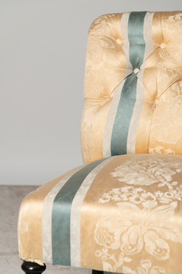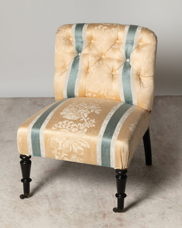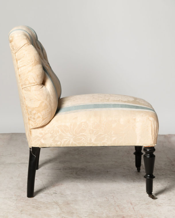 19th Century buttoned back French slipper chair, ready for your own upholstery. Ideal fireside, bedroom or occasional chair. Seat depth 18 inches, floor to seat 15 inches.