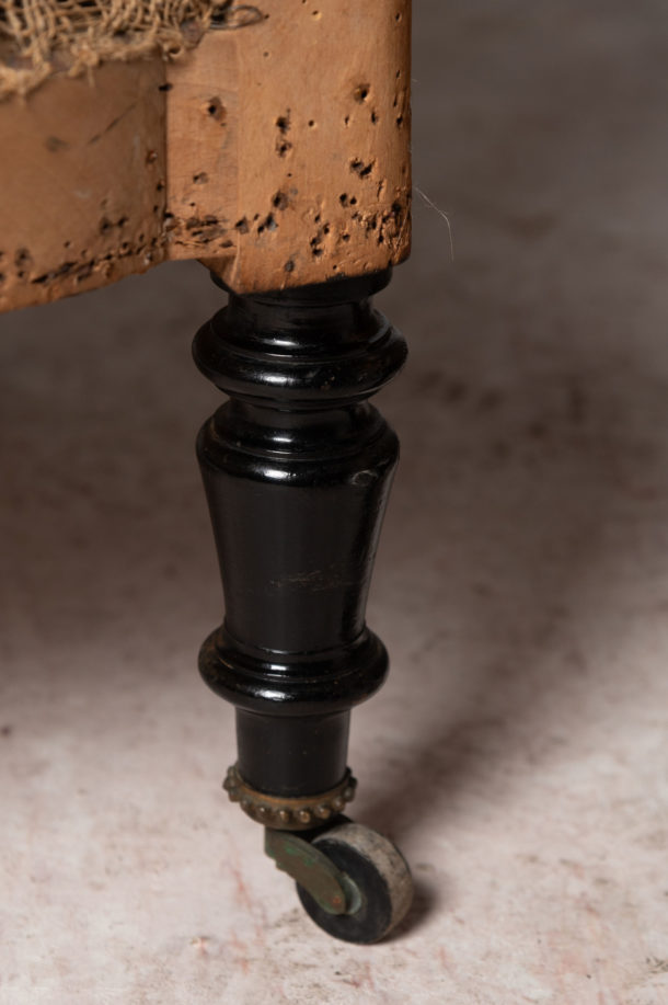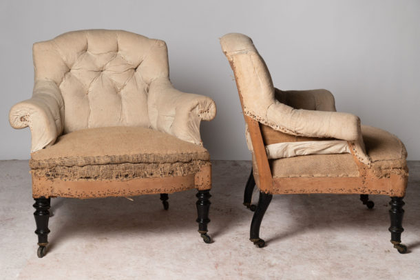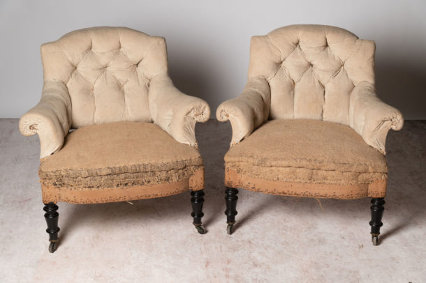 Rare small size pair of Napoleon III French chairs, 19th Century. They could be upholstered with a plain back if preferred (without buttons), low back. Seat depth 18 inches.