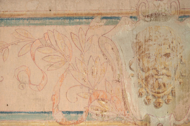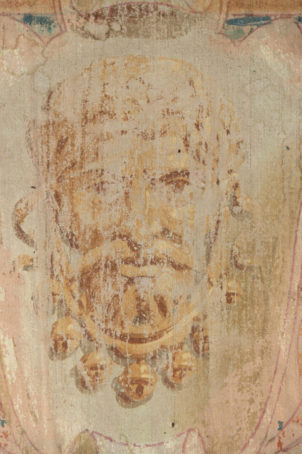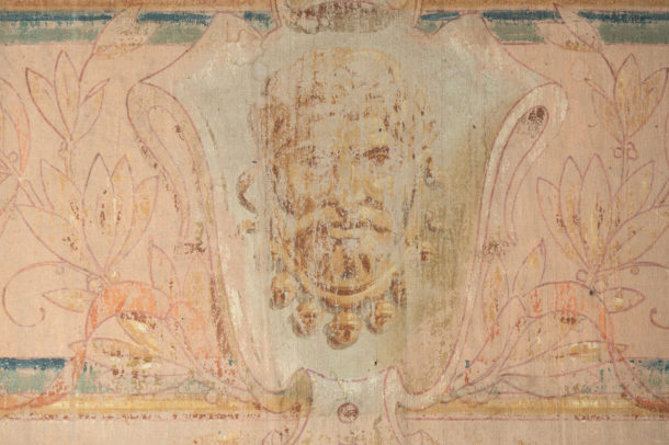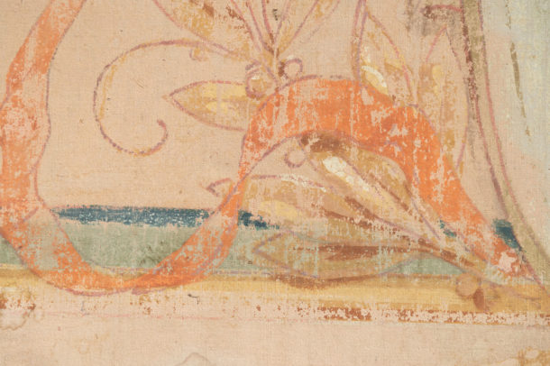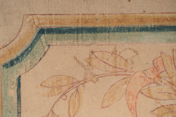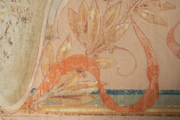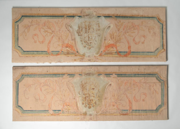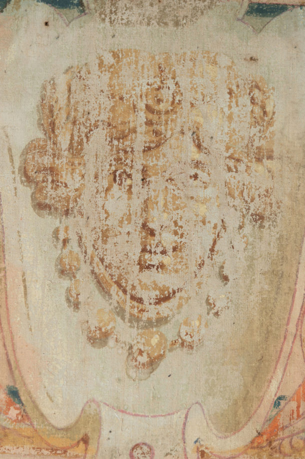 A large pair of hand painted antique canvas panels, male & female, later mounted on a wooden frame. Most likely from a theatre originally. Early 20th Century. Age related wear, marks, all in keeping for the age, lovely soft colour tones. They would work well in any room together or as a stand alone piece in two rooms, or above a bed !.