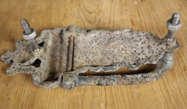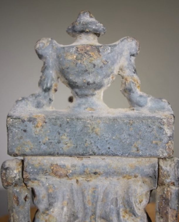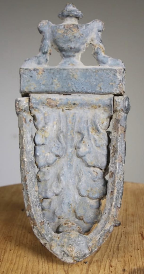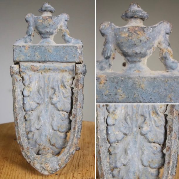 Early 19th Century – 1815, cast iron Regency door knocker, English, it features an urn vessel to the top over an acanthus leaf corbel, large size, all complete with new threaded bolts to the back to easily attach to a door. Still in the lovely old pale blue paint. The below depth does not include the bolts.