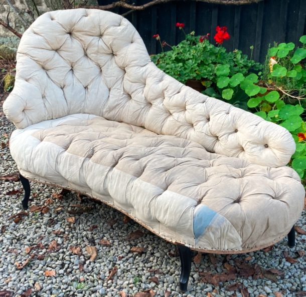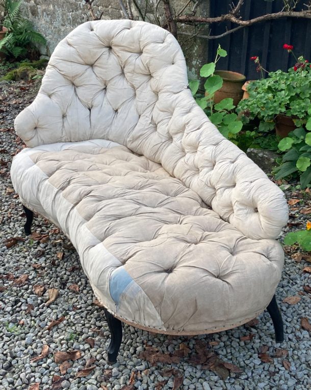 Wonderful antique French chaise – daybed, fully buttoned, your upholsterer could upholster this with a plain back or plain seat if preferred or totally plain. Rare model. Seat length – 55 inches