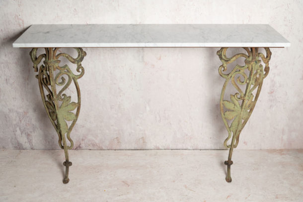 Original Art Nouveau cast iron balcony elements have been skilfully reused to create this console table. New Carrara marble top. Original patina and paint on the legs. It simply screws to the wall. The elements were sourced in Provence.