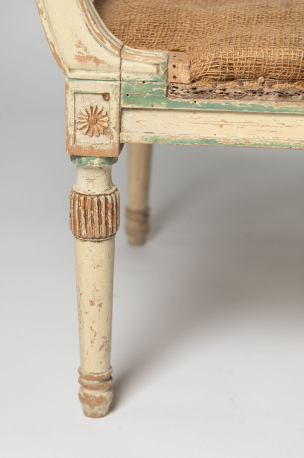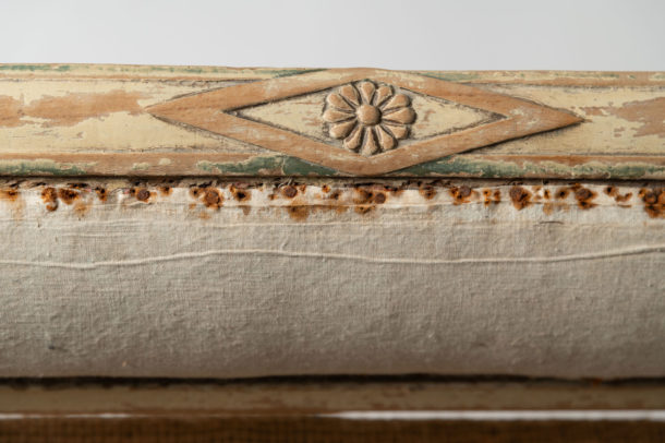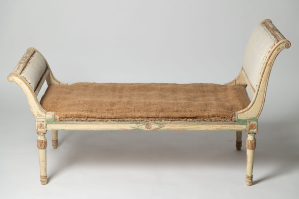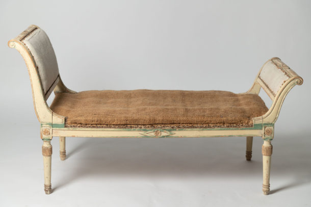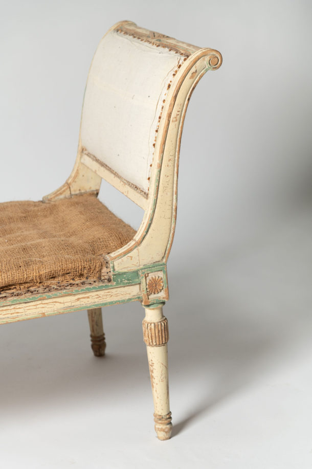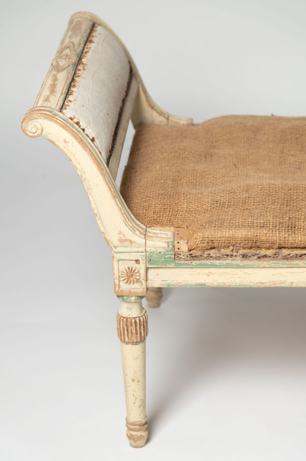 Unusual antique French daybed – stool, Directoire style, original paint, perfect size for the end of a bed, hallway, 19th Century, ready for upholstery.