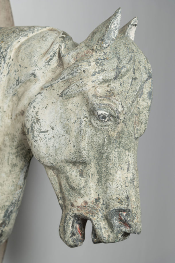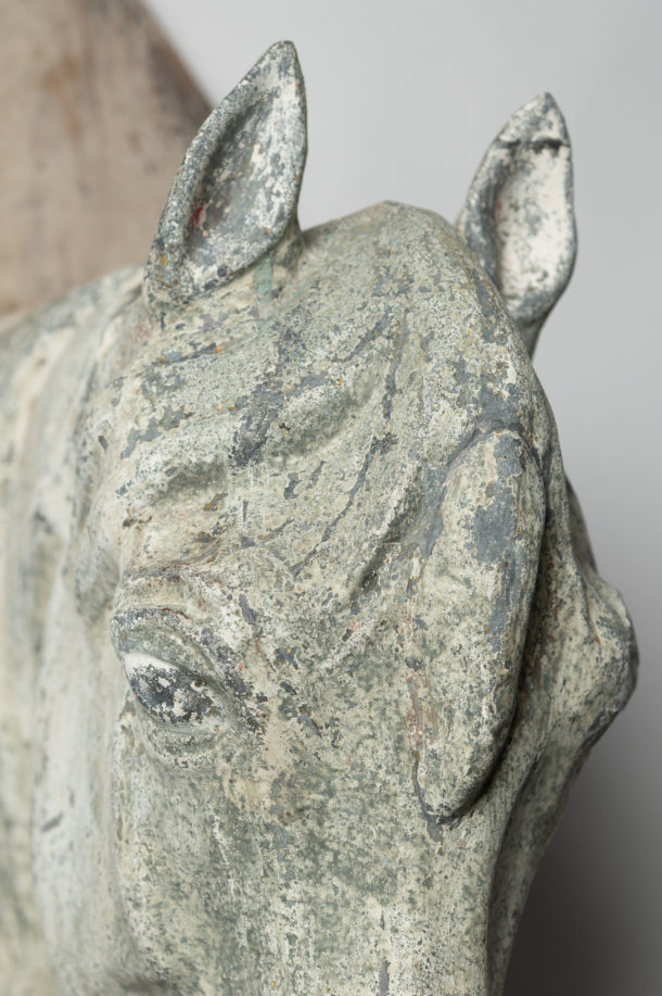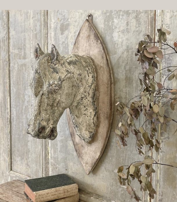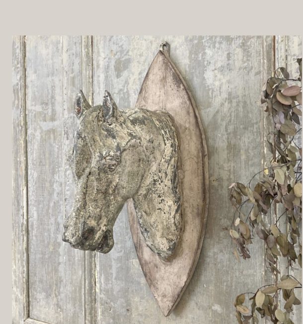 Beautiful 19th Century French zinc horses head on the original wooden base, original paint. Ready to hang.