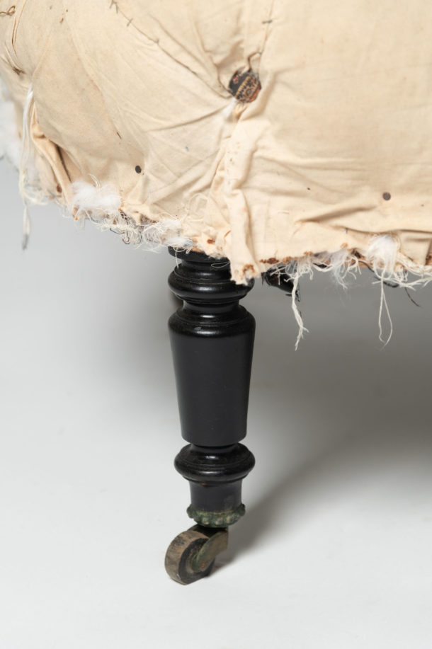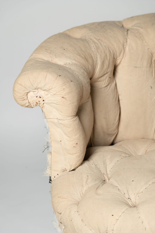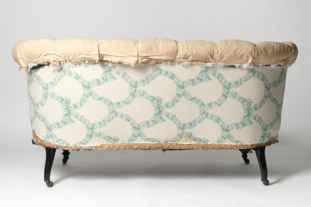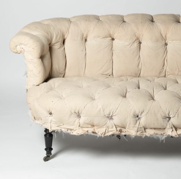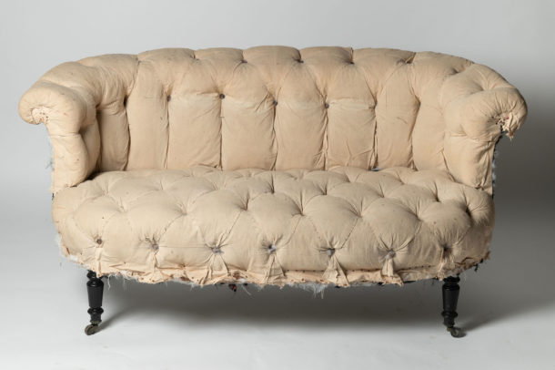 A lovely low back antique French Napoleon III sofa, it could be upholstered with a plain back or plain seat if preferred (without buttons) a nice deep seat, rare model. Seat depth 23 inches.