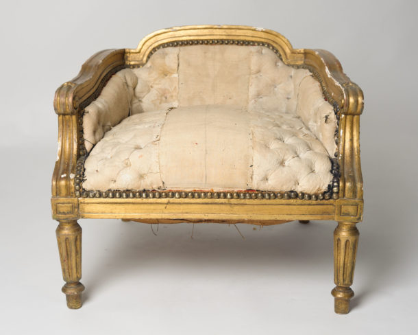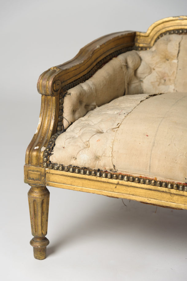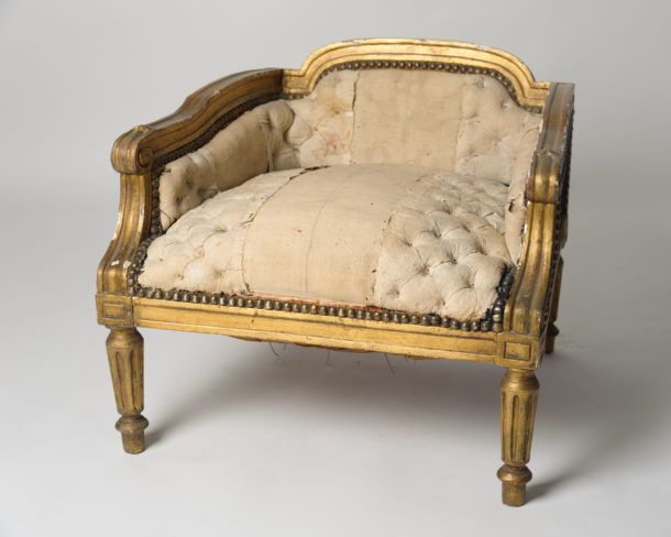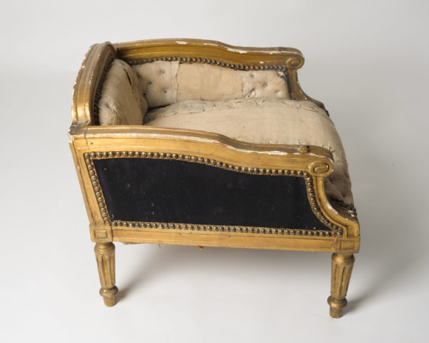 Unusual antique French original dog or cat bed. Original gilt. Pretty buttoned seat. Charming piece. Floor to seat 12″ Seat depth 18″