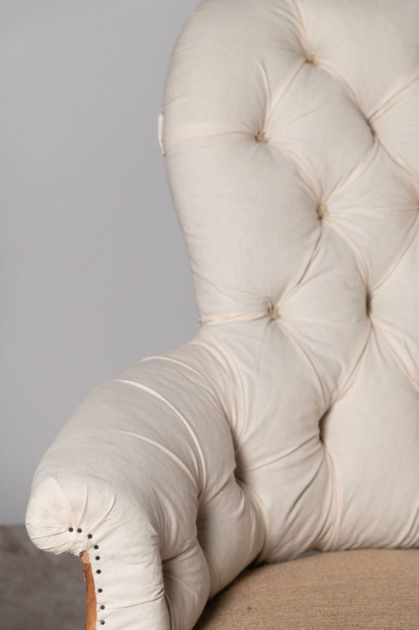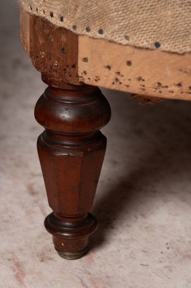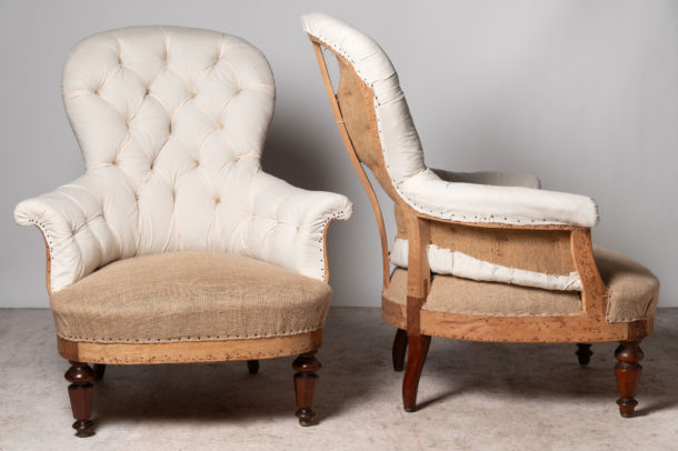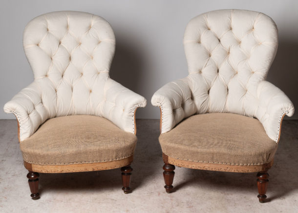 Generous size pair of antique French chairs. They could be upholstered with a plain back (without buttons) if preferred. Seat depth 24 inches.