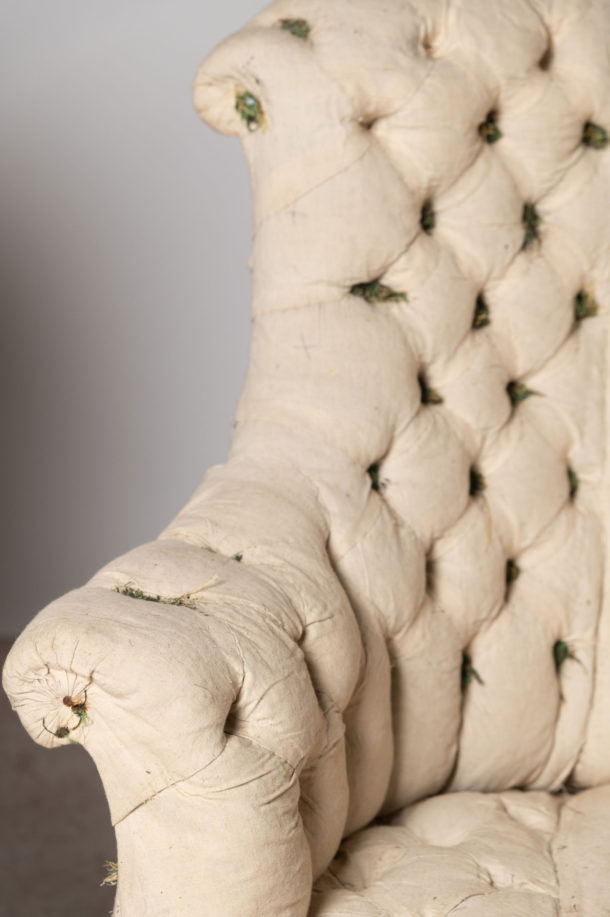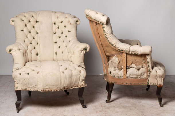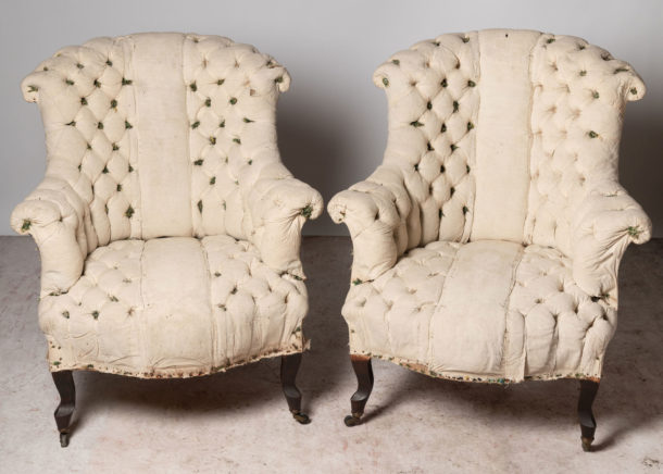19th Century French pair of buttoned chairs, Seat depth 20 inches. They could be upholstered without buttons if preferred.