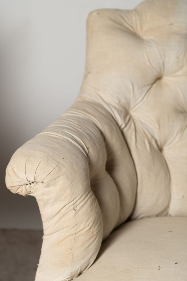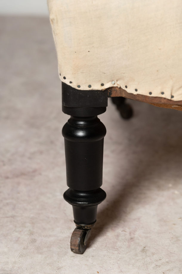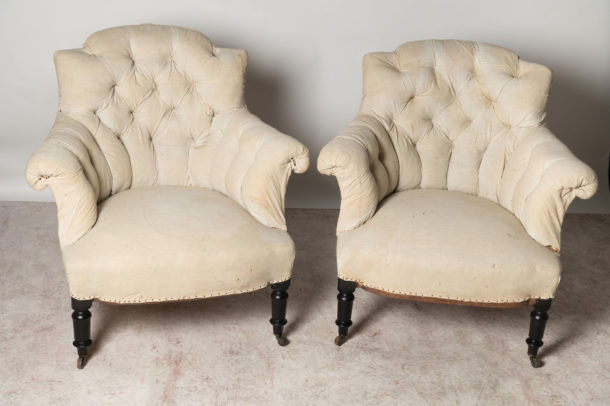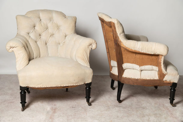 Buttoned back pair of antique French Napoleon III chairs, a nice shape and size. They could be upholstered with a plain back if preferred (without buttons). Seat depth 20.5 inches.