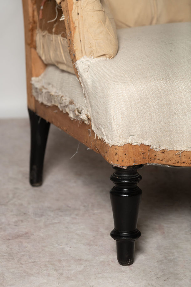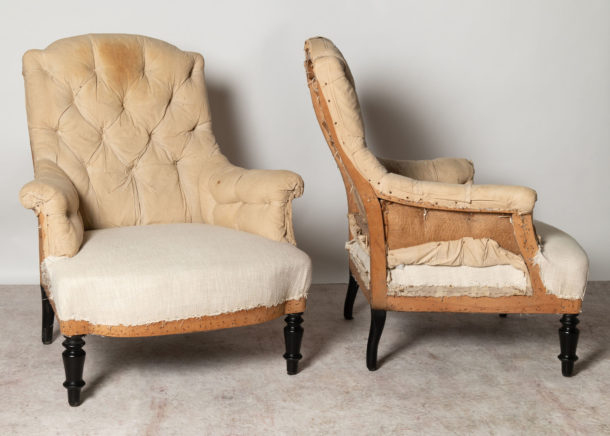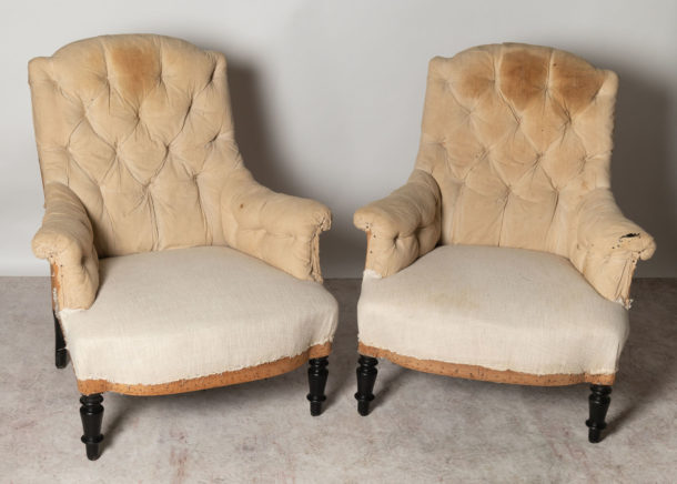 A nice size and shape pair of antique French Napoleon III chairs, buttoned back, they can be upholstered with a plain back (without buttons) if preferred. Seat depth 21 inches.