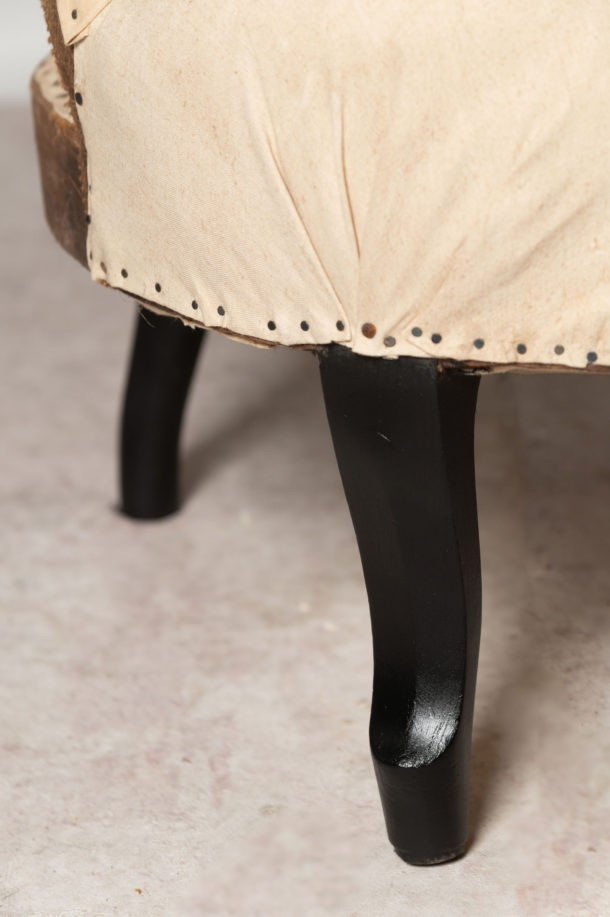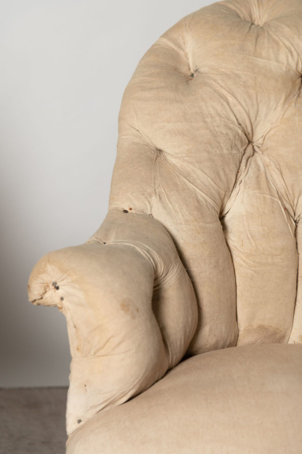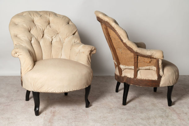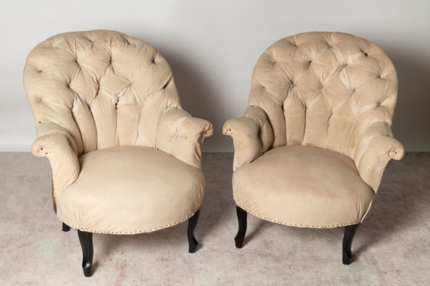 A pretty shape pair of small antique French button back chairs, they could be upholstered with a plain back (without buttons) if preferred. Seat depth 19.5 inches.