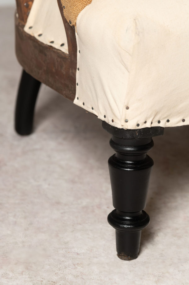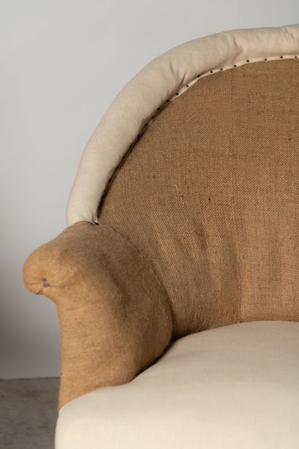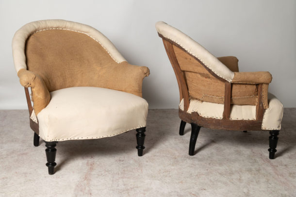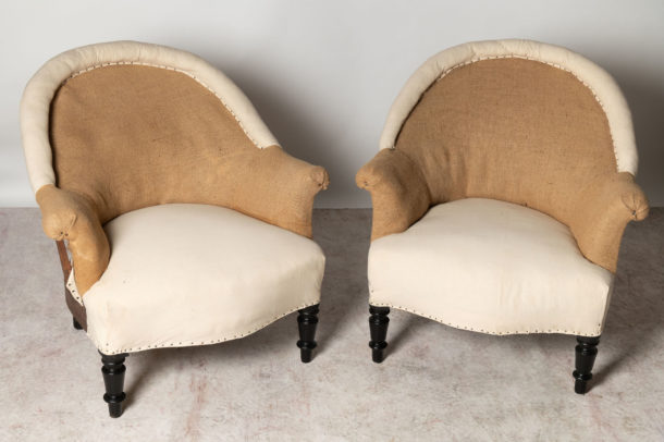 Unusual shape pair of rolled edge antique French chairs. Seat depth 20 inches.