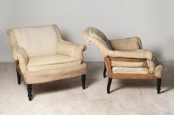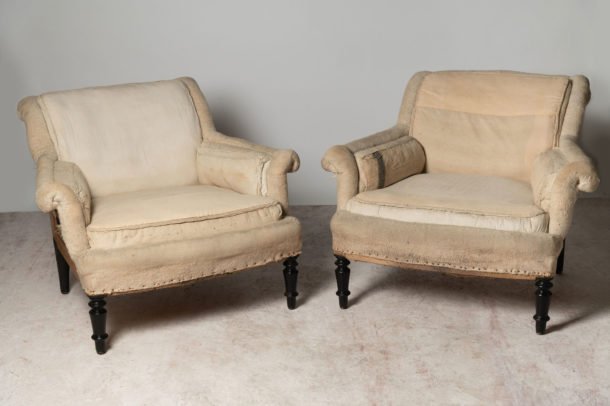 Rare model, 19th Century large pair of low back, scroll back chairs. Seat depth 23 inches. Floor to seat 16 inches.