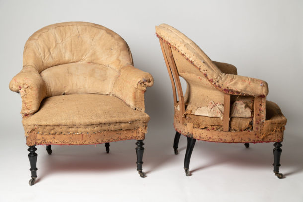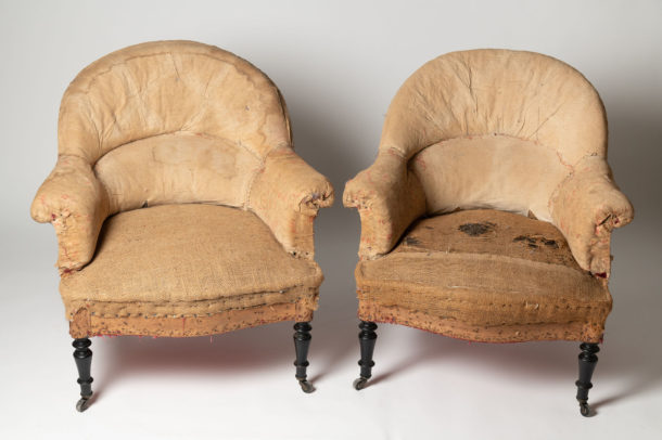 A nice shape and size pair of antique French tub chairs, 19th Century. Seat depth 19 inches.