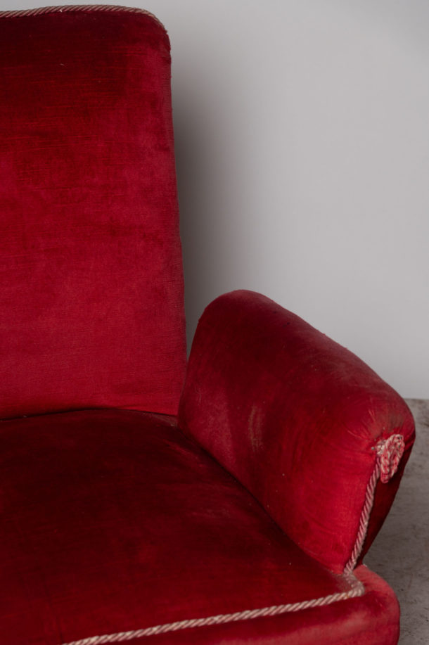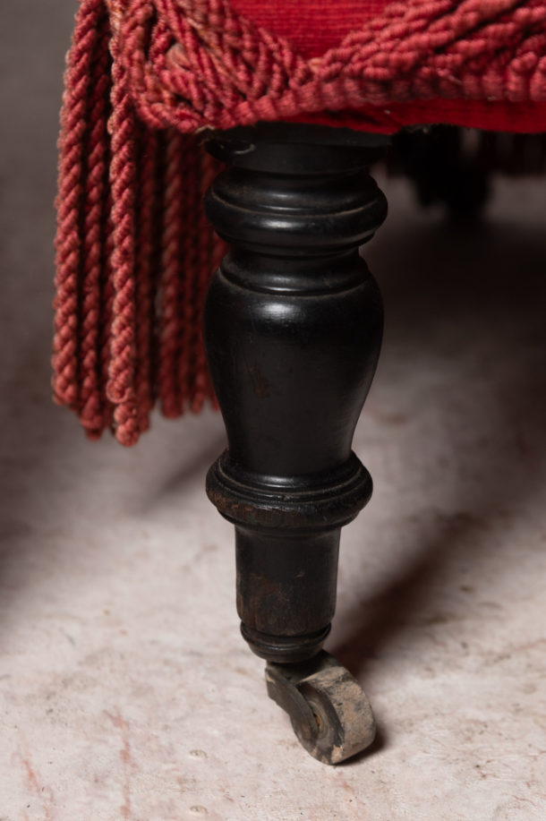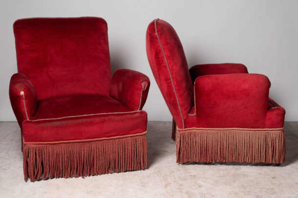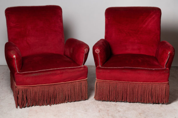 Generous size pair of antique French saddle bag chairs, unusual model, ready for your own upholstery. Seat depth 21 inches.