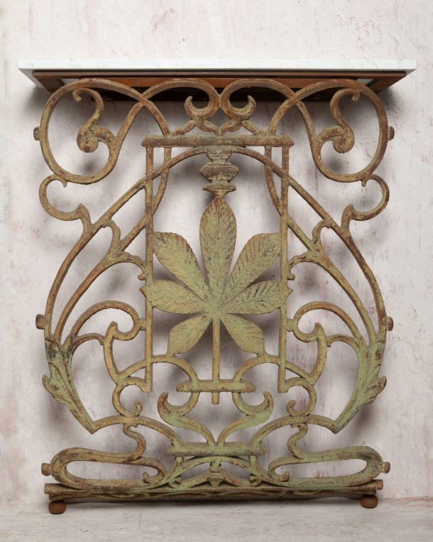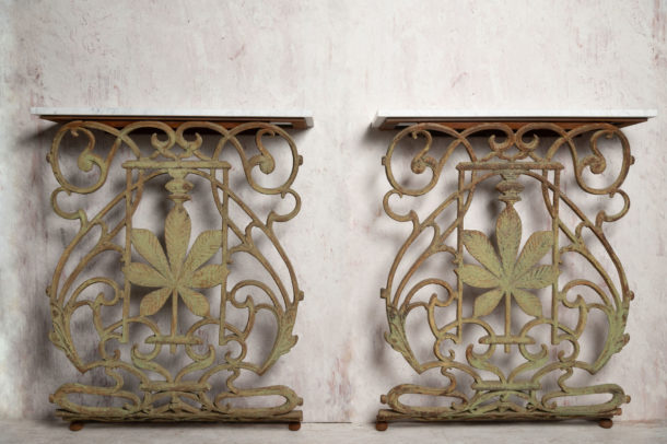 Original Art Nouveau cast iron balconies converted to a pair of console tables, original patina and paint, new Carrara marble tops. Sourced in Provence. They simply screw to the wall and the marble sits on top. £2,250 the pair.