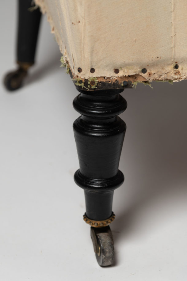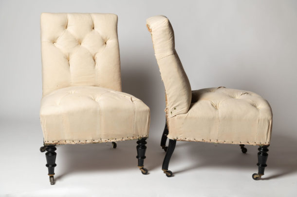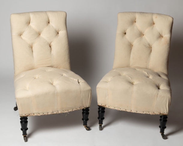 Napoleon III pair of buttoned slipper chairs, ideal fireside, bedroom or occasional chars. Nice deep seat. They could be upholstered with a plain back or plain seat if you do not want buttons. Seat depth 17 inches. Good floor to seat height, 16 inches.