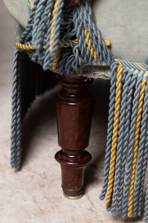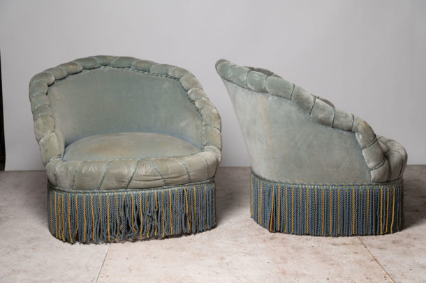 Generous size pair of antique French low back piecrust chairs ready for your own upholstery. Rare model. Seat depth 24.5 inches.