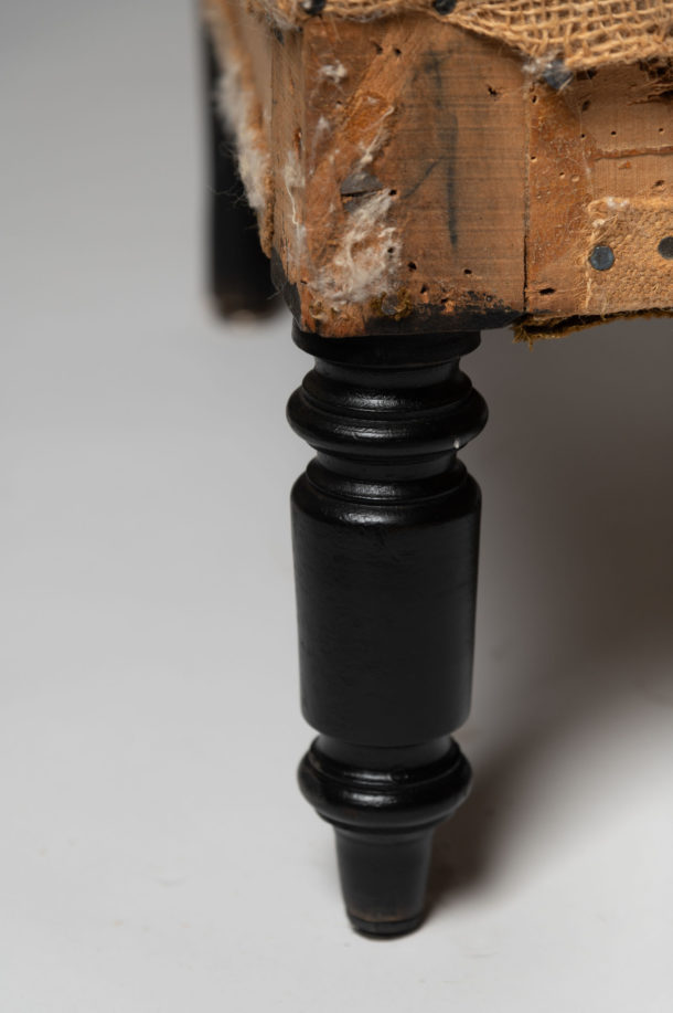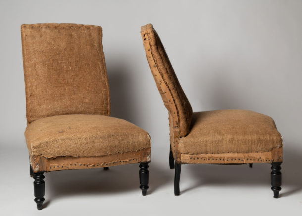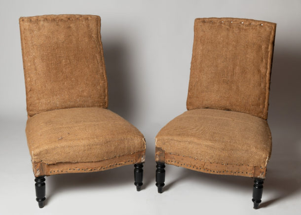 Antique French pair of slipper chairs. Seat depth 19 inches. Ideal fireside, bedroom or occasional chairs.