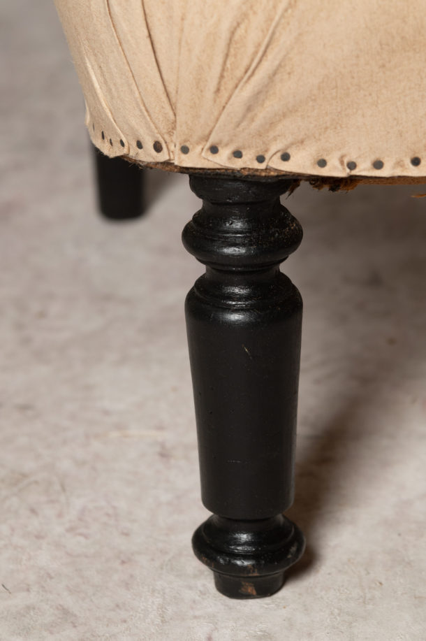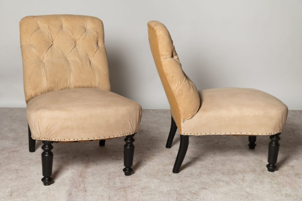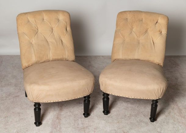 Antique French pair of button back slipper chairs, they could be upholstered with a plain back (without buttons) if preferred. Ideal fireside, bedroom or occasional chairs. Seat depth 18 inches.