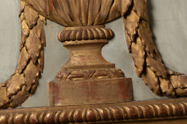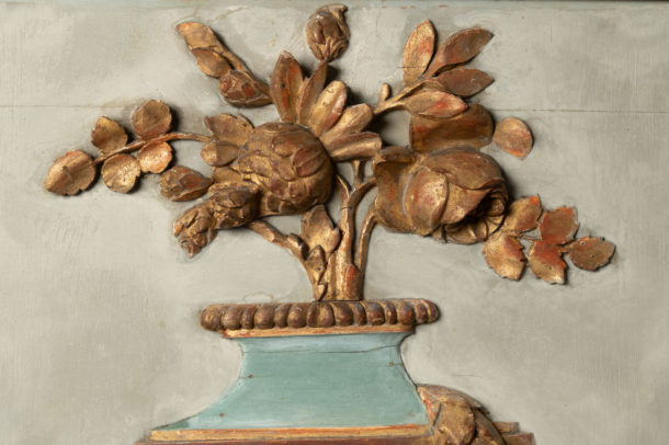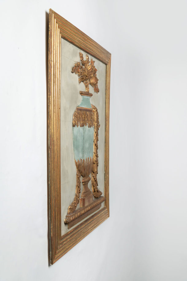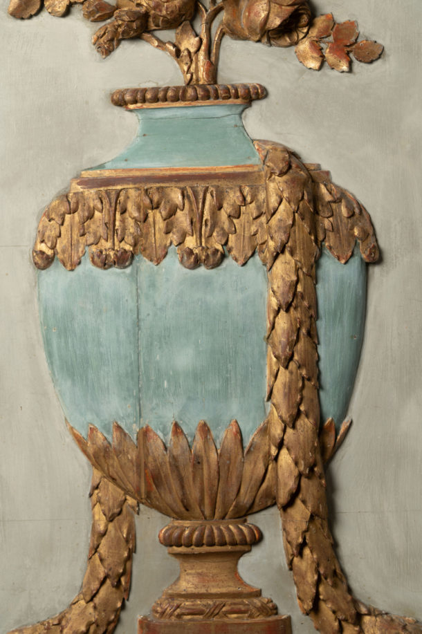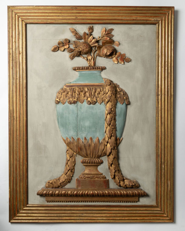 Superb Louis XVI carved and painted wood panel. Large flowering vase and oak leaf garlands. Good condition. Late 18th century.