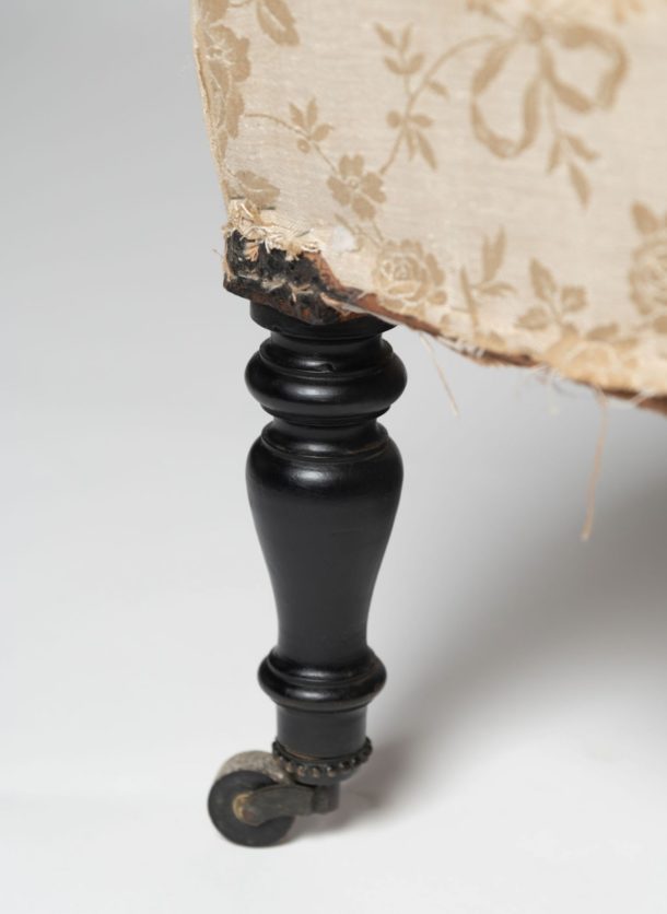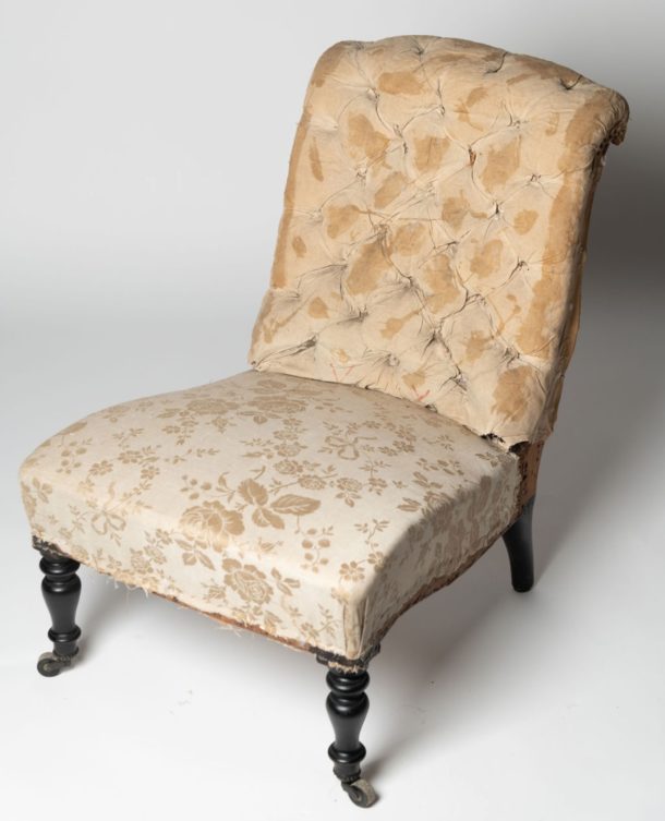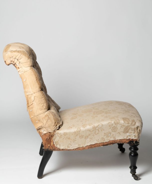 Antique French scroll back, button back slipper chair, 19th Century. Your upholsterer could upholster this with a plain back if preferred, a pretty shape chair. Ideal fireside, bedroom or occasional chair. Seat depth 18 inches.