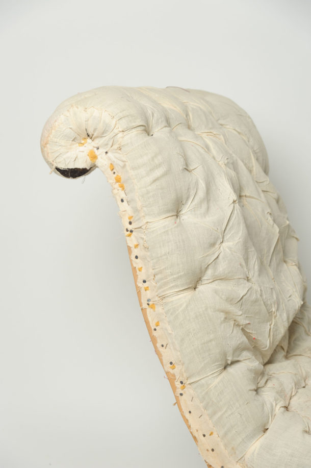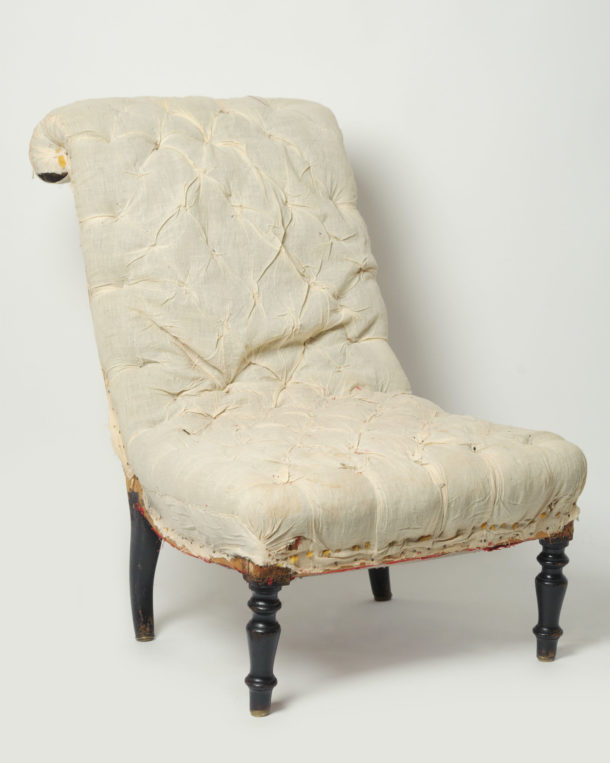 Pretty antique French slipper chair. 18″ deep in the seat.