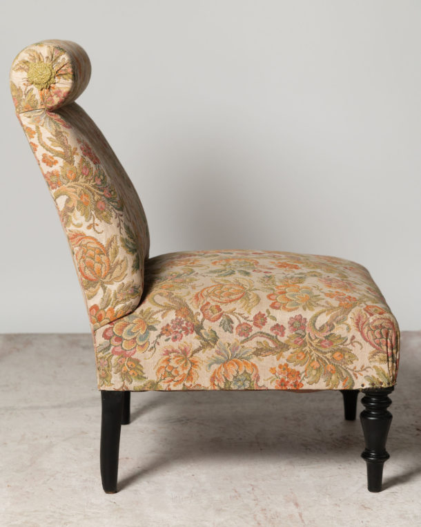 Unusual antique French slipper chair with a bolster cushion, ideal fireside, bedroom or occasional chair. Seat depth 18 inches.