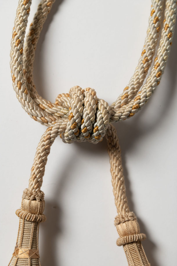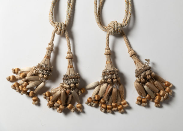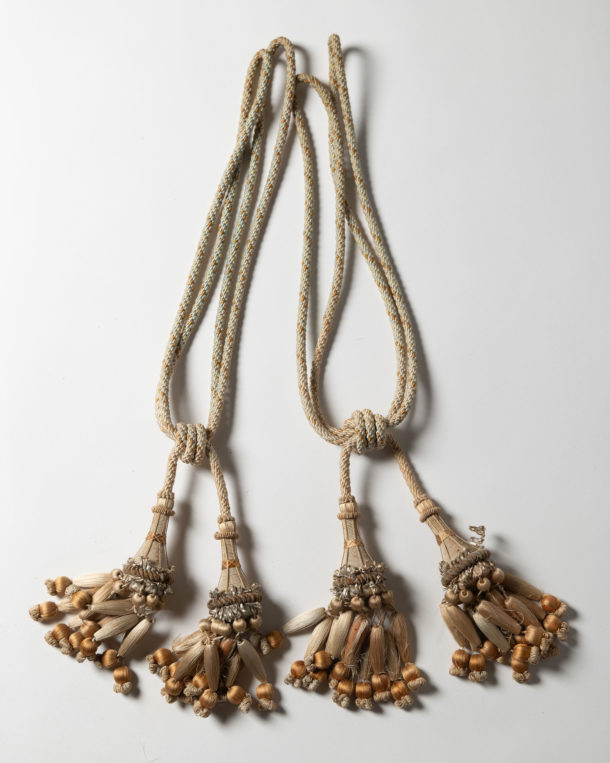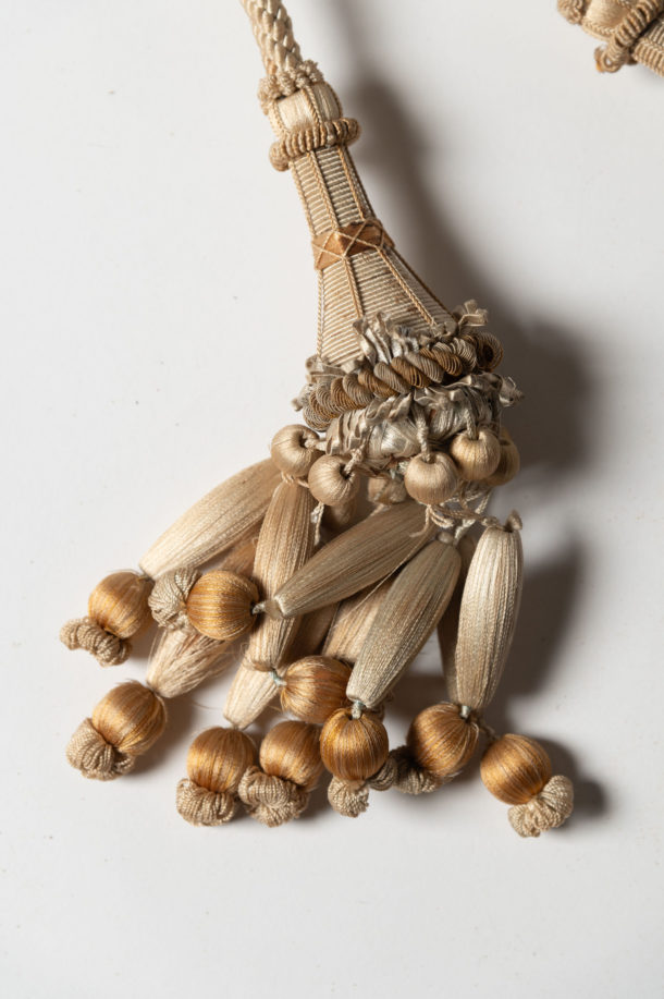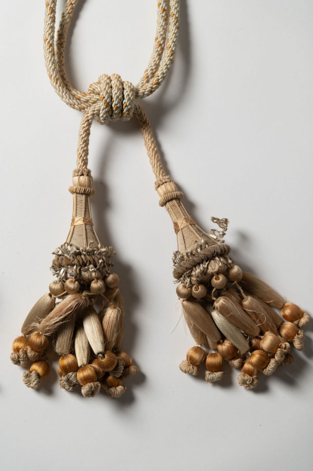 Pair of antique French tiebacks, age related wear as to be expected. Decorative hanging on a door or a bed or used as tiebacks.