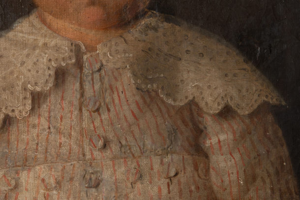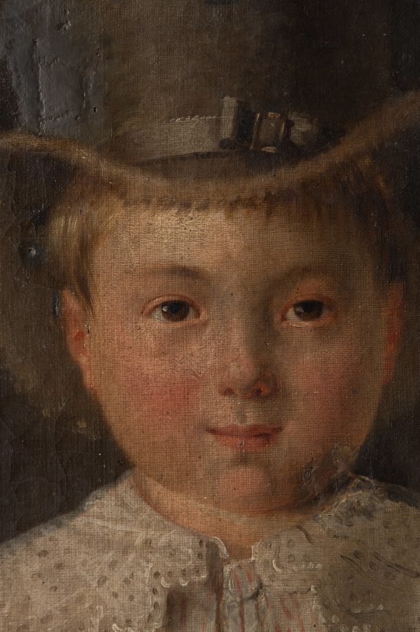 Early 19th Century signed oil on canvas. Dated 1830. I can only imagine that this little boy was from a very wealthy family to have his own top hat in this period. Age related wear, restoration patches over the years, all adding to the honesty of this painting that is nearly 200 years old.