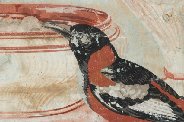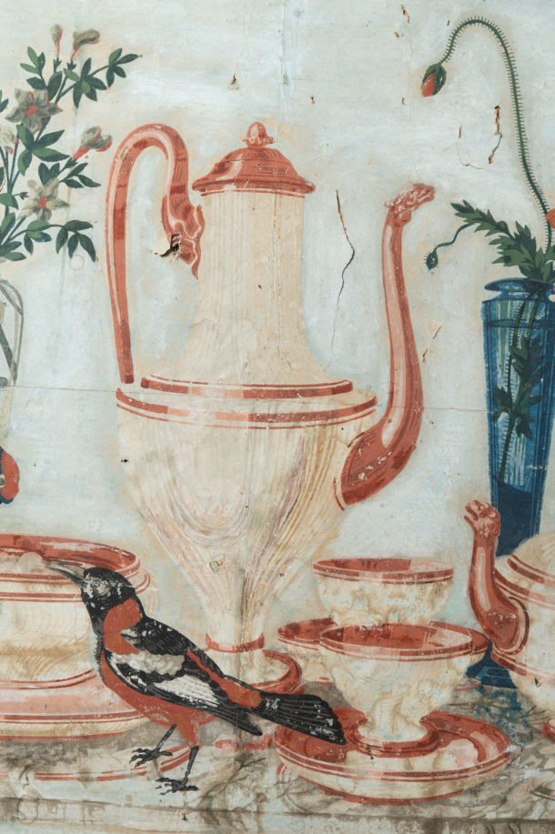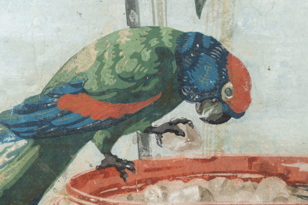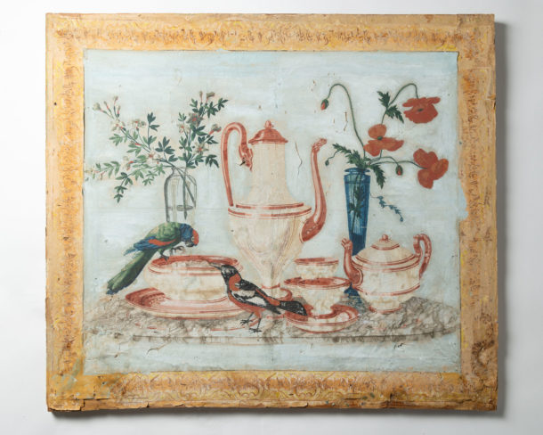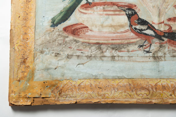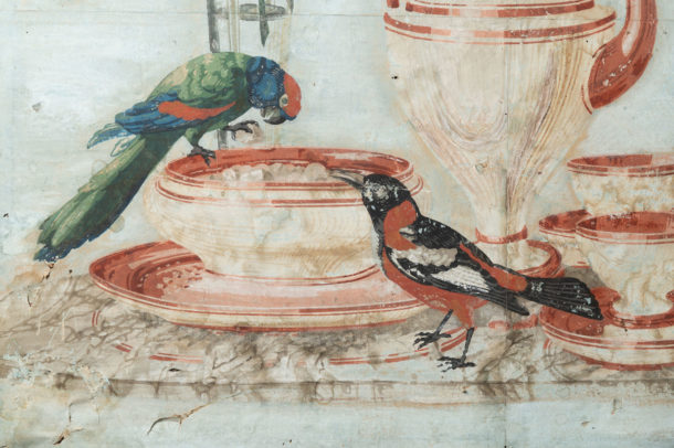 18th / 19th Century antique French hand painted paper panel, wonderful colours, “A Birds Tea Party” ! Age related war & marks, all in keeping for the age.
