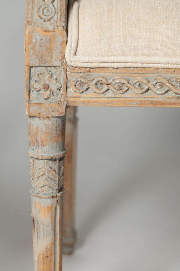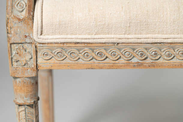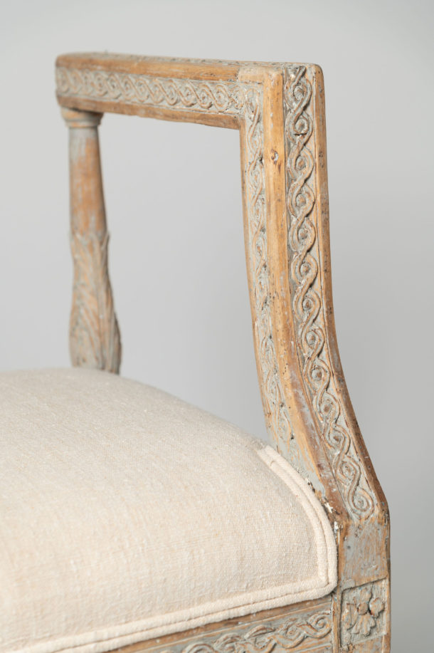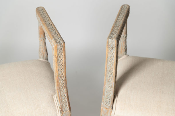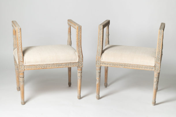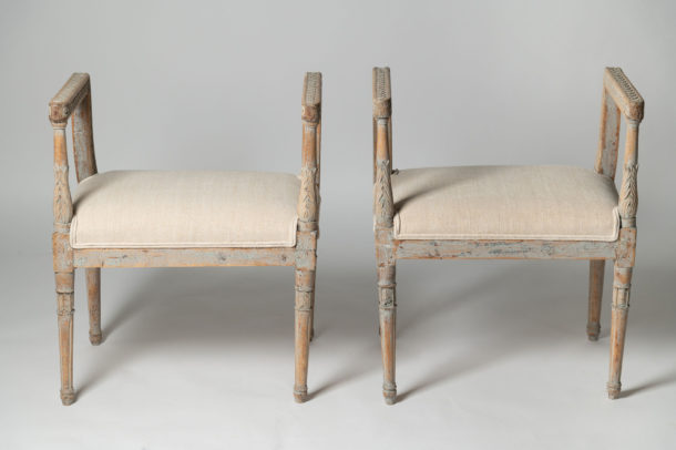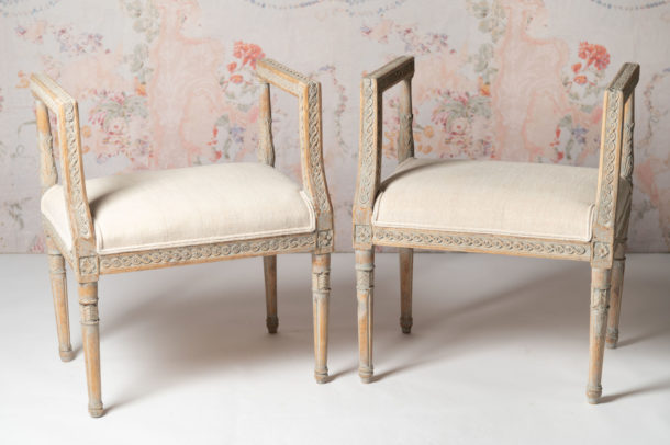 Rare pair of antique Swedish benches – stools, c1800, recently upholstered in antique linen. Floor to seat 17 inches.
