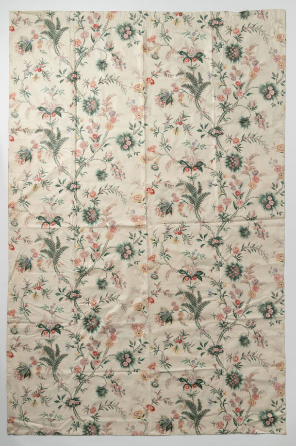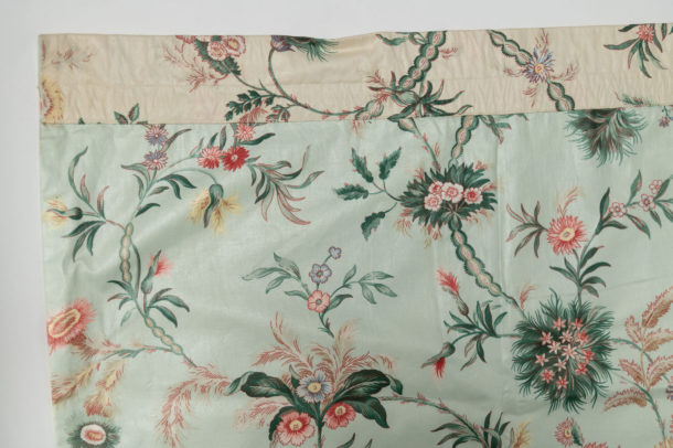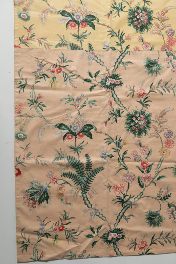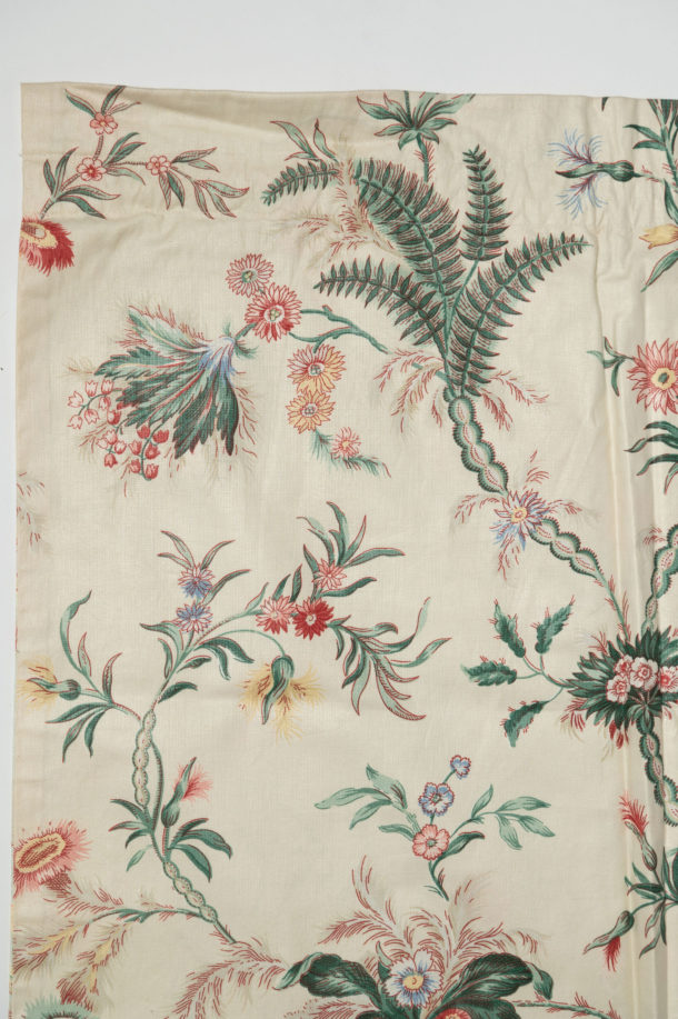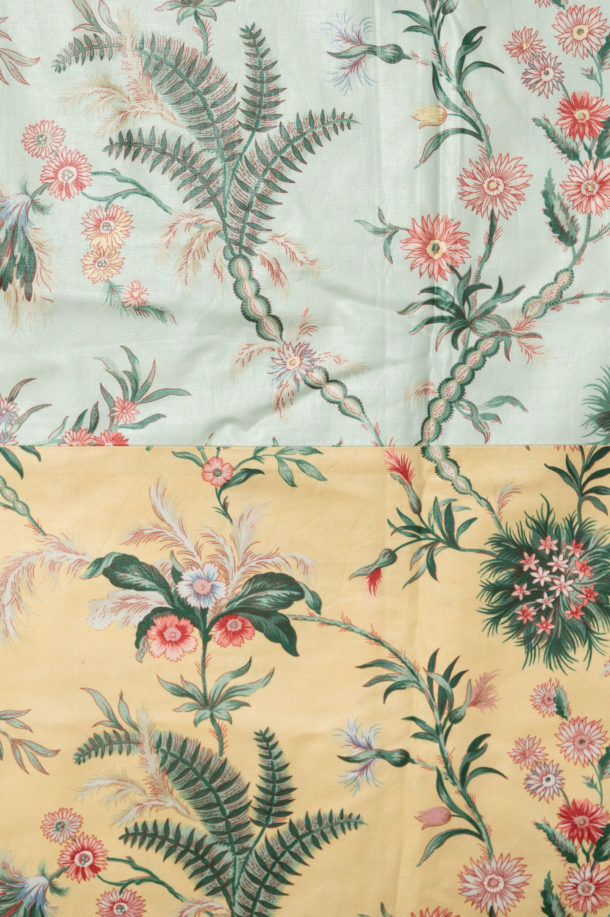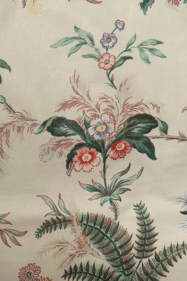 In the hand-block method, each colour is put on separately and each will require several blocks, for instance the Jean Monro fabulous motif, Lucy’s Roses, has 180 blocks per repeat! The design details are applied by a combination of methods but all by hand and once printed, minute retouches, using the dye from the tray, are then also done by hand. Hand-blocks are notoriously difficult to produce to exact colour tolerances as the take-up of the cloth is subject to changes in the atmosphere and differences in drying times as well as different handblockers (who each carry their own recognisable style of printing). This process is repeated for each pattern repeat and for every colour down the whole length of the 18 meter table until that length is complete which can take up to a week. Admittedly, this is a very slow and labour-intensive process but the end result is a fabric of great beauty and subtlety that is truly inimitable. Because of the method of production there are variations within the length of the cloth which add to the charm of the final product.