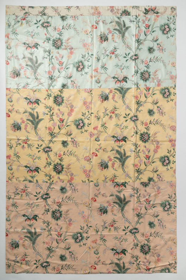 Shop display fabric panel, showing samples of the three fabrics on the front and one on the back, finished at the top so a pole can be pushed through, ready to hang. I purchased this from a reputable textile dealer who believed it to be Mrs Monro. The colours are wonderful with a very light chintzes. A lovely wall hanging. It could also be used over a bed or chair. (sorry I did not get a chance to iron it before the photoshoot !)
