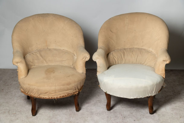 Antique French pair of chairs. Seat depth 21 inches.