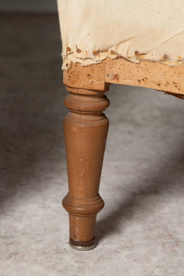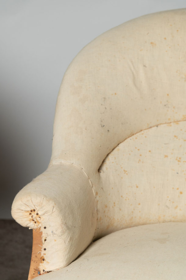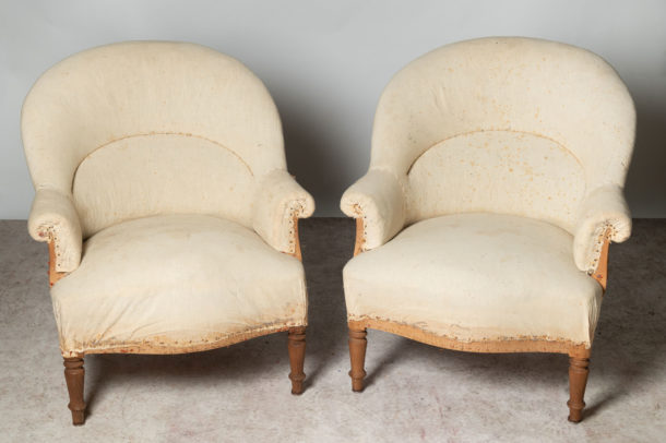 Antique French pair of tub chairs, a nice shape and size. The legs could be stained darker or ebonised back if preferred. Seat depth 20 inches.