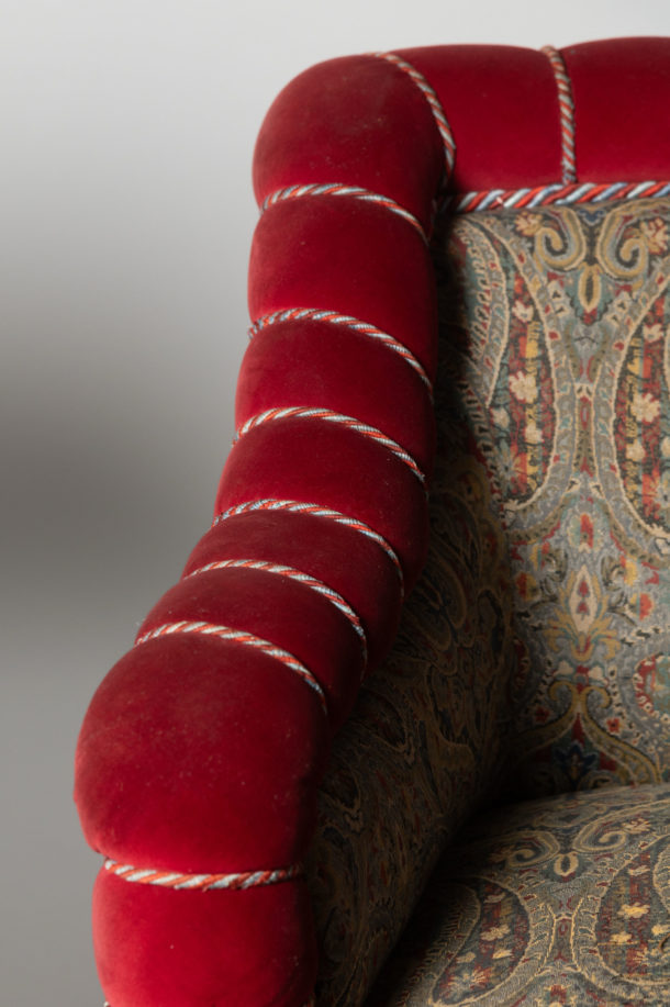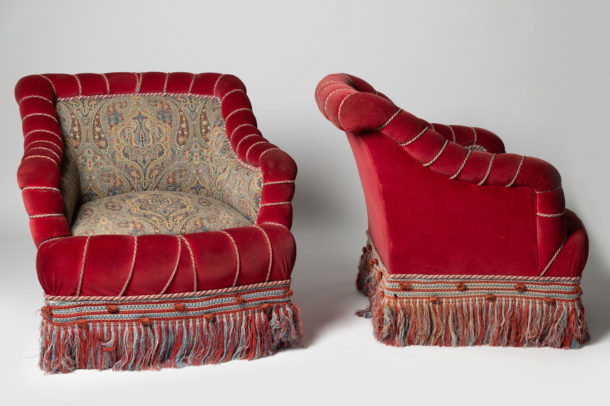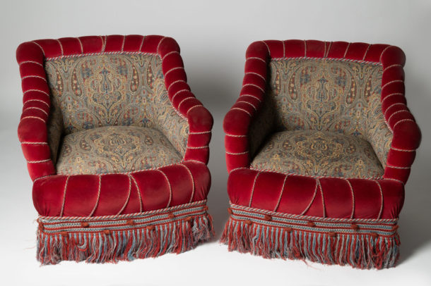 Rare pair of antique French Napoleon III pie crust chairs, low back, ready for your own upholstery. Seat depth 21 inches. 19th Century.