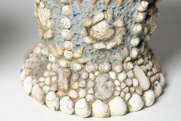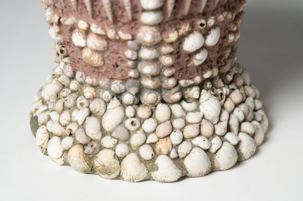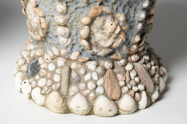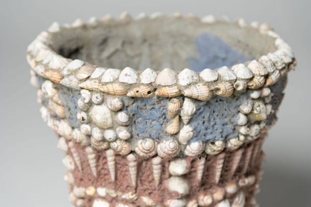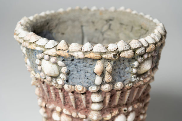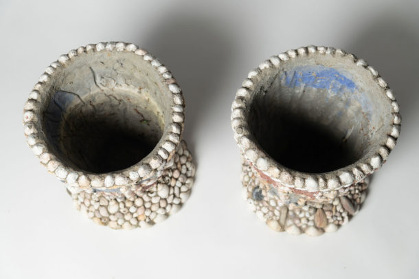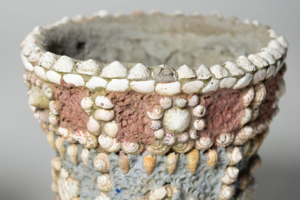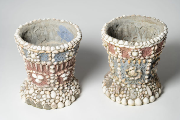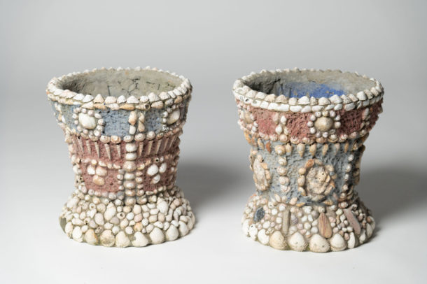 Grotto pair of French planters – urns, lovely colours. A few odd shells are missing, nothing that detracts.