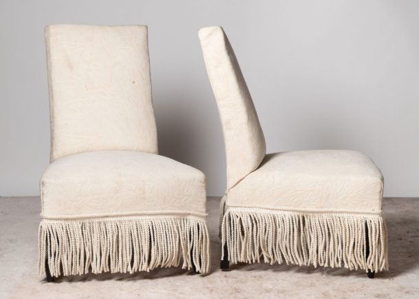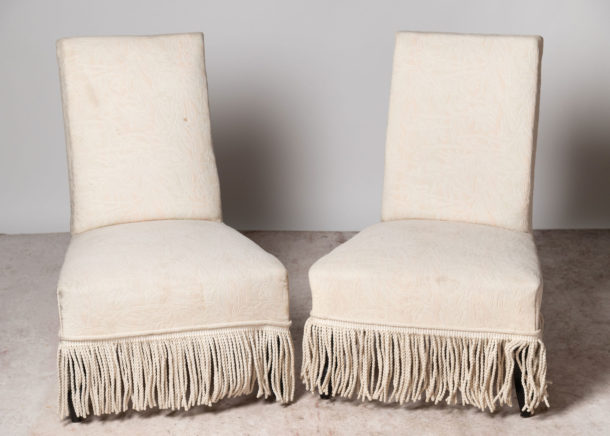 Antique French pair of slipper chairs, ideal fireside, bedroom or occasional chairs. Ready for your own upholstery. Seat depth 16 inches.