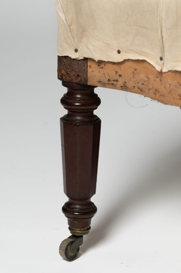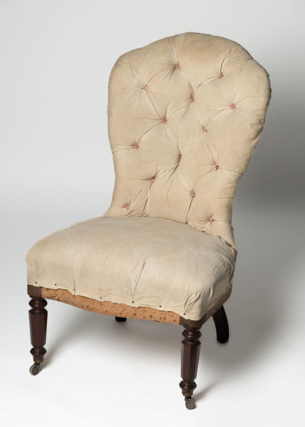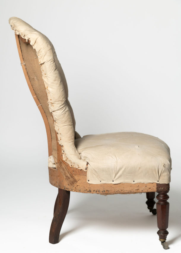 Unusual antique French slipper chair, ideal fireside, bedroom or occasional chair. Seat depth 17 inches. Floor to seat 15 inches.