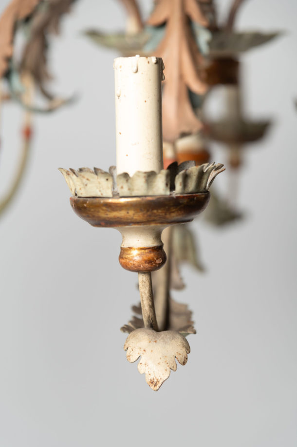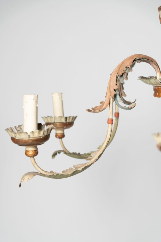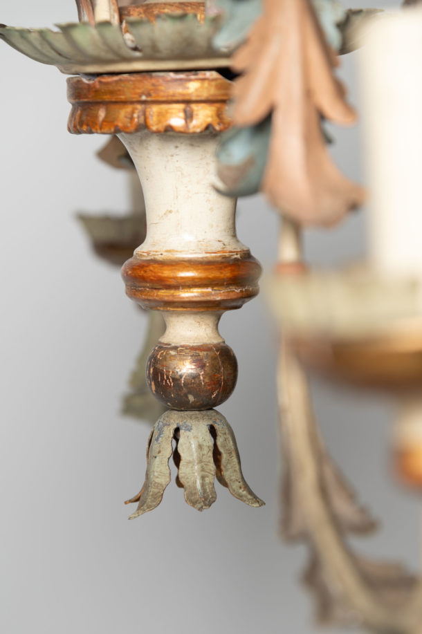 Pretty tole & wood Italian chandelier, 6 arms, fully rewired, original soft pastel paint. The below height does not include any chain, this could be added as required. There is a fully detectable extending iron pole that could be used if you have very high ceilings.