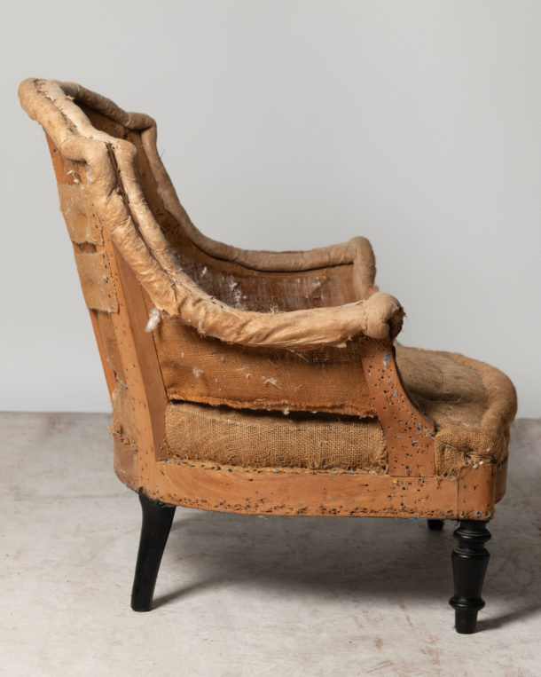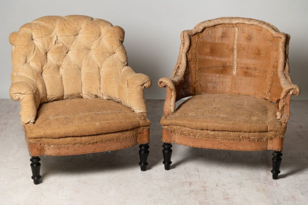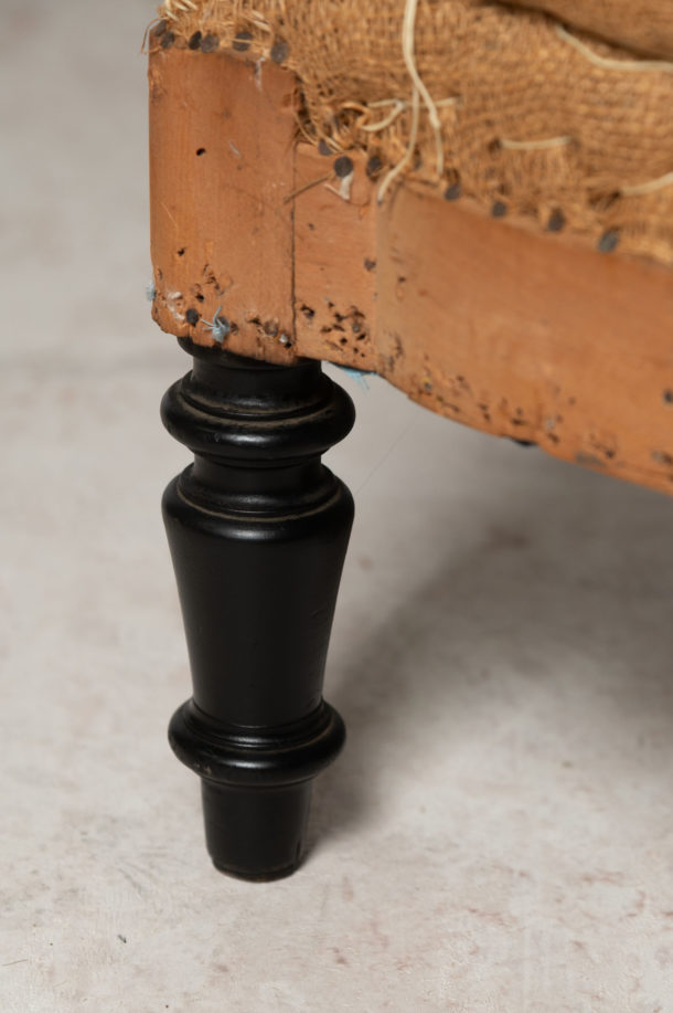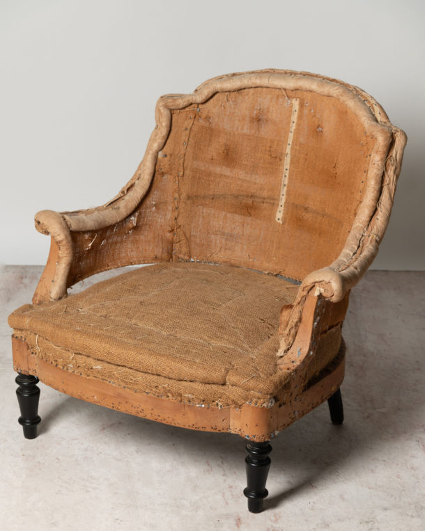 This chair is one of a pair, we had to strip it down without the original horsehair in the back, it has been priced accordingly to cover the extra padding. The other one of the pair is shown in the last picture and is listed for sale separately @ £585. This chair could be upholstered with a button back or a plain back. The difference currently of one inch in height to the other chair is just because it does not have the padding yet.