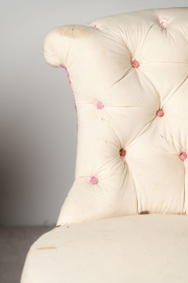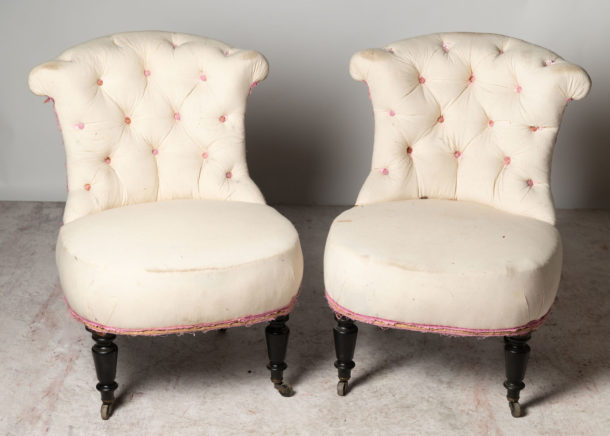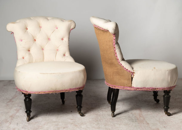 19th Century pair of Napoleon III slipper chairs, button back. Seat depth 18.5 inches. Floor to seat 14.5 inches. Ideal fireside, bedroom or occasional chairs.