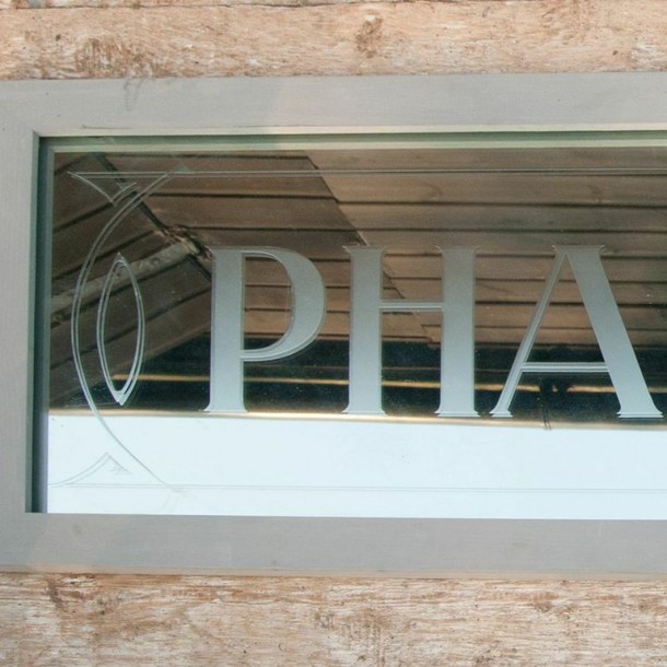 Original French “Pharmachie” etched glass mirror