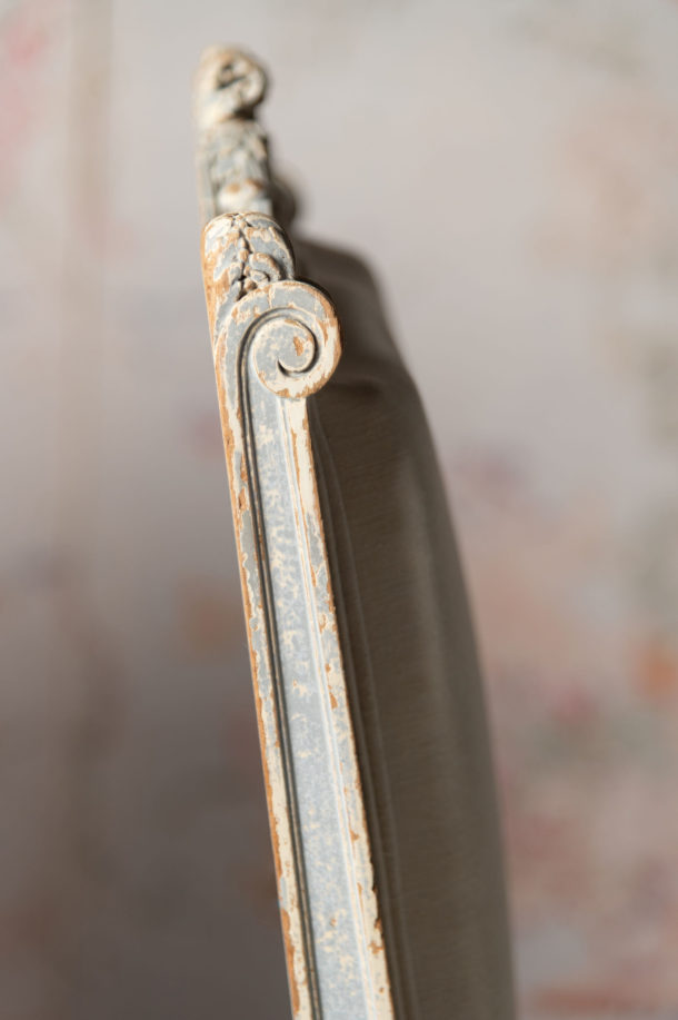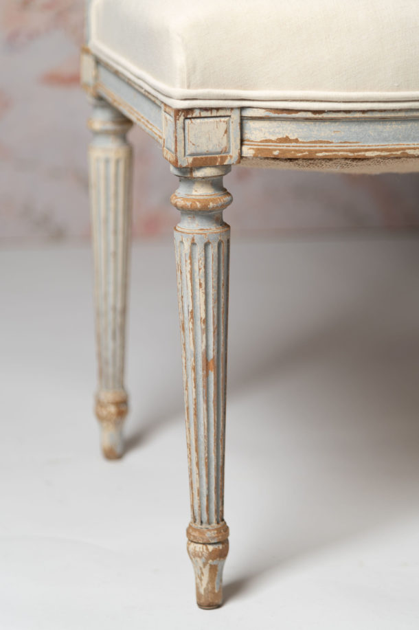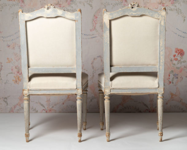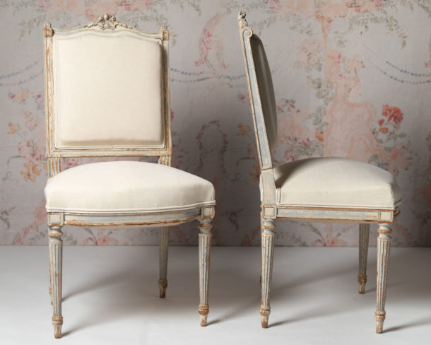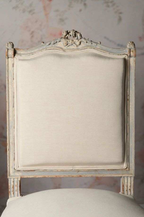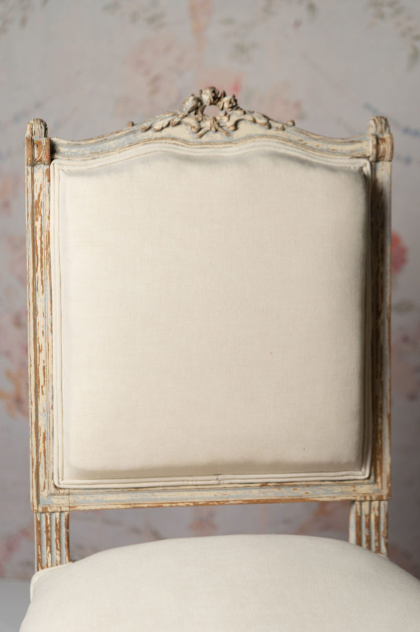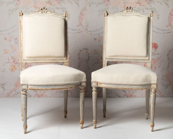 Pretty pair of antique French chairs, lovely carved detail, original paint. Seat depth 16 inches, floor to seat 18 inches. Recently upholstered in antique French linen.