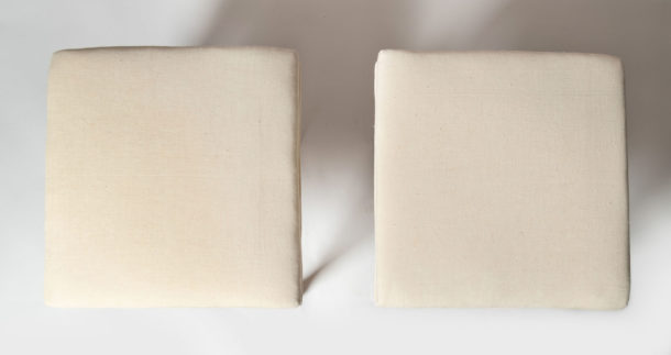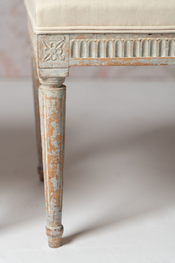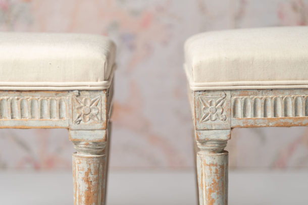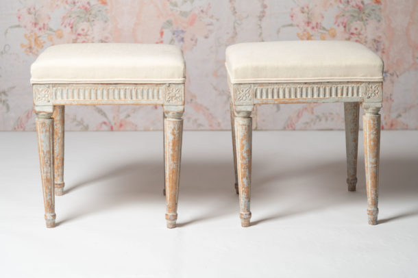 Period pair of antique Swedish Gustavian stools, c1790, recently upholstered in antique linen, original paint.