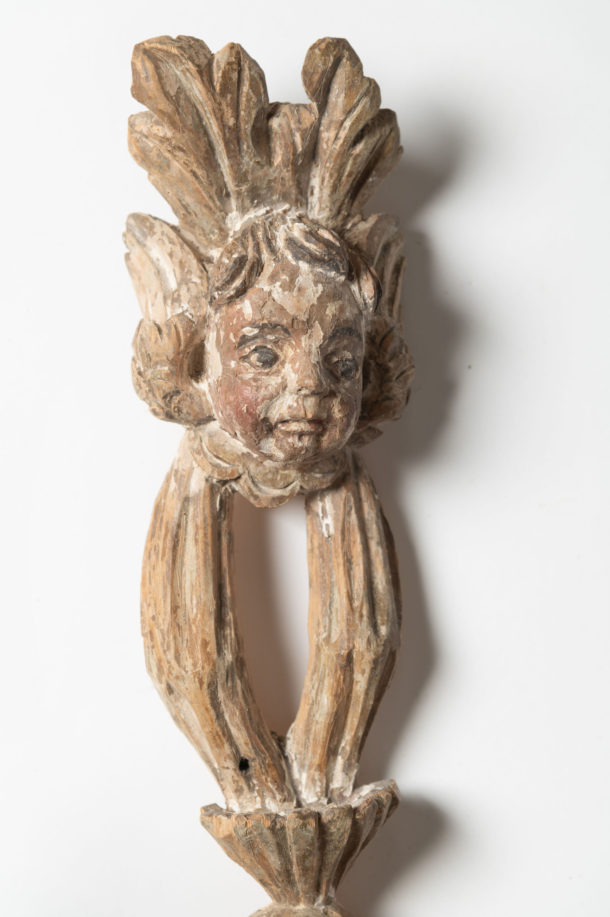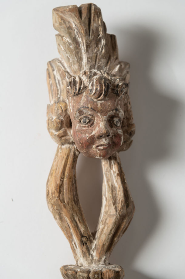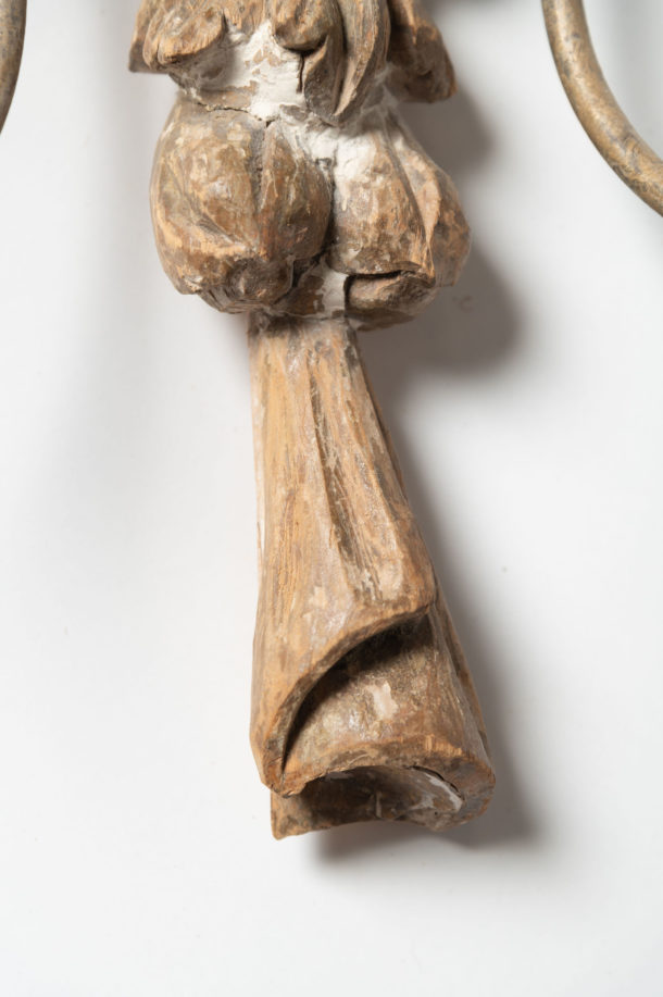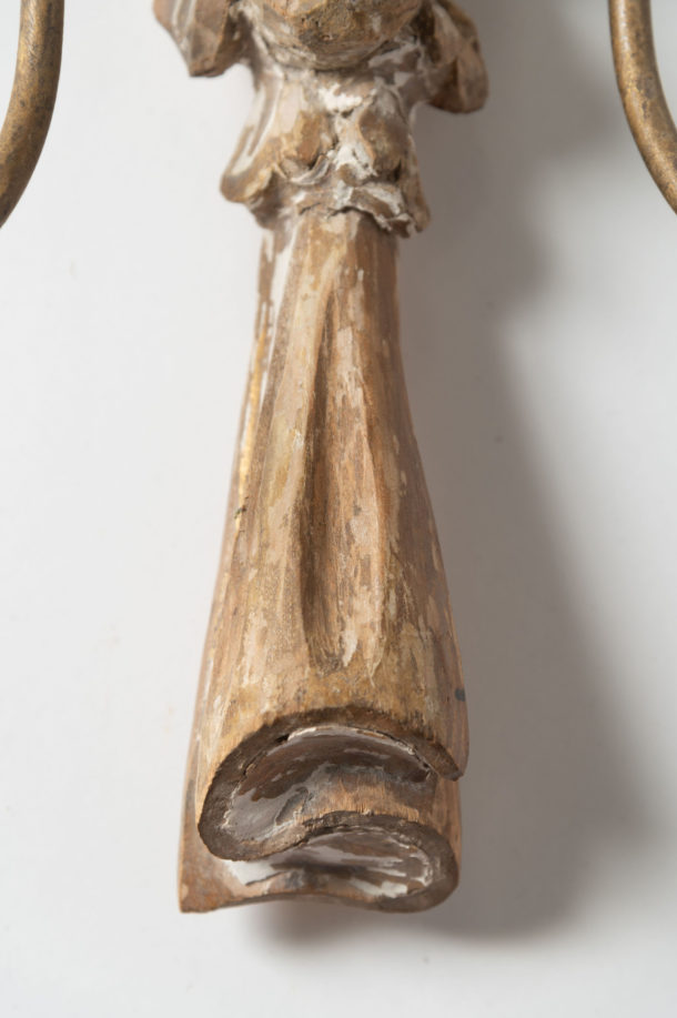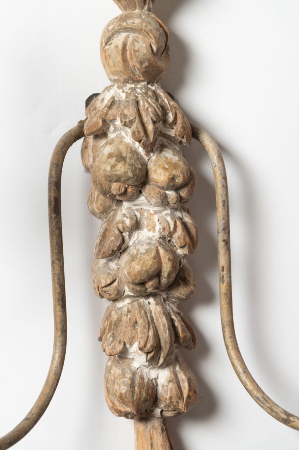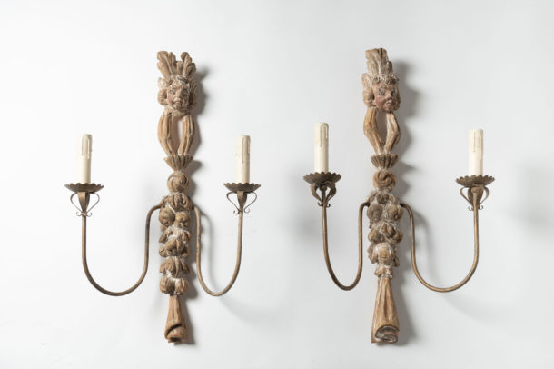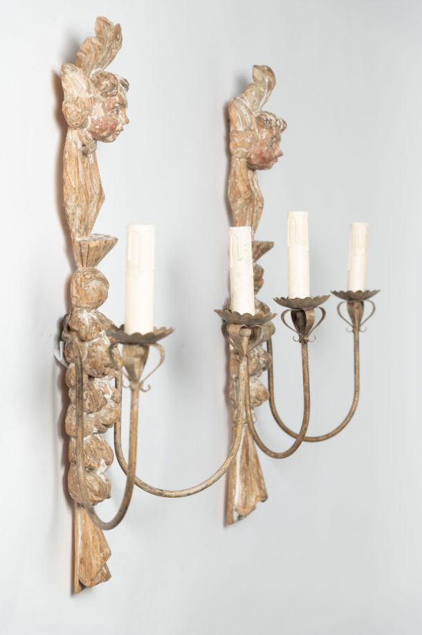A lovely large pair of antique Italian wall lights, fully rewired, original paint, as they are hand carved they will show slight differences, metal arms.