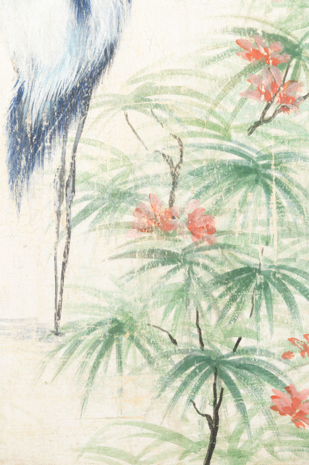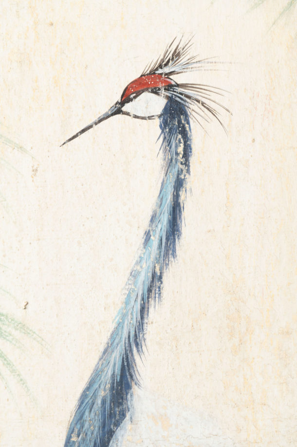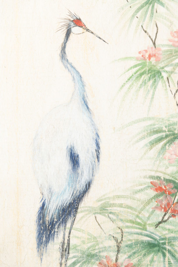 Contemporary pair of painted birds on canvas, Italian.