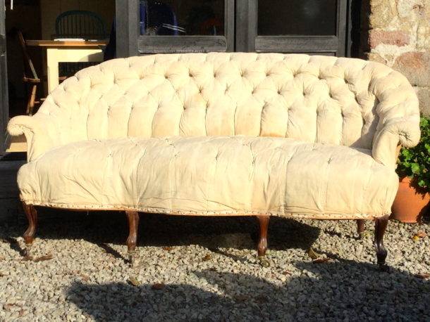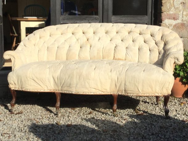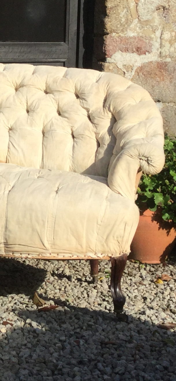 Rare shape and size 19th Century French buttoned sofa. Elegant Cabriole legs on the original casters.